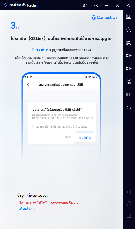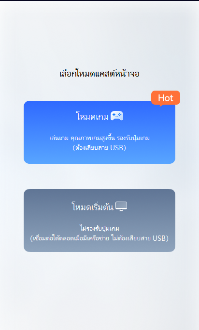 เลือกโหมดการเชื่อมต่อ (โหมดเกมต้องใช้ปุ่มเกม: ต้องเชื่อมต่อด้วยสาย USB; โหมดปกติใช้สำหรับควบคุมโทรศัพท์จากระยะไกล: ไม่ต้องเชื่อมต่อด้วยสาย USB)