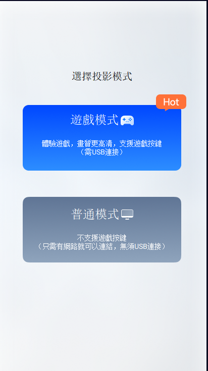選擇連線模式(需要遊戲按鍵選擇遊戲模式:需要USB線連線 只是遠端操作手機選擇普通模式:無鬚USB線連線)